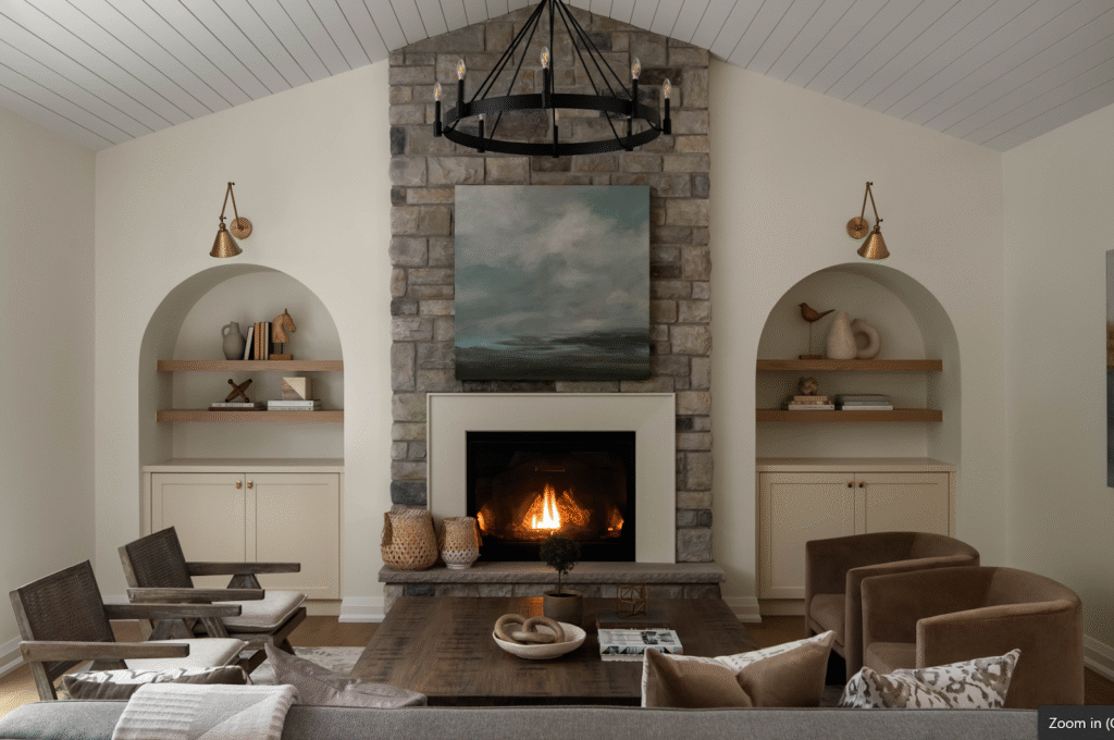 Custom millwork and refined detailing add depth at every turn, but it’s the Great Room that truly anchors the home—a vaulted ceiling opens the space, while a dramatic stone-clad fireplace, flanked by arched built-ins, draws you in.