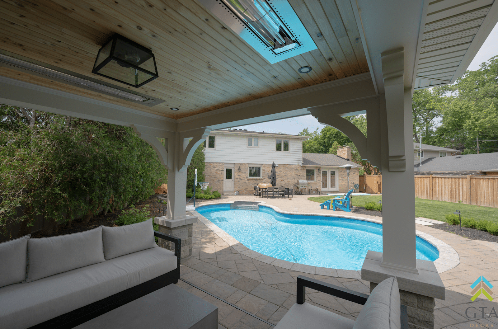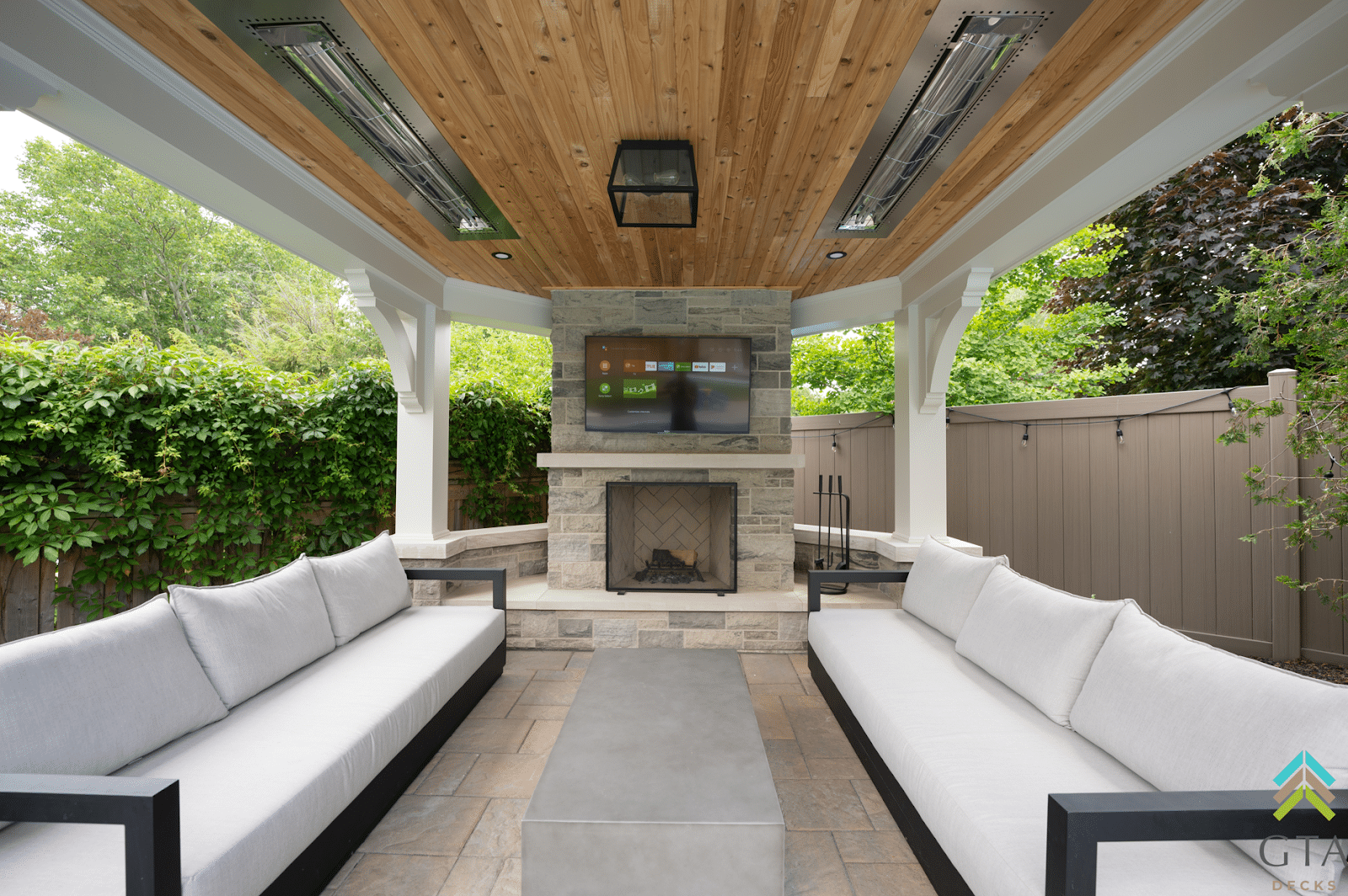 Built-in heaters tucked into the cedar soffits extend the seasons, while thoughtful details—like the generous lounge area and layered material palette—create a setting that’s as refined as it is relaxed. From quiet mornings to late-night gatherings, every element was designed to make the outdoors feel like home.
