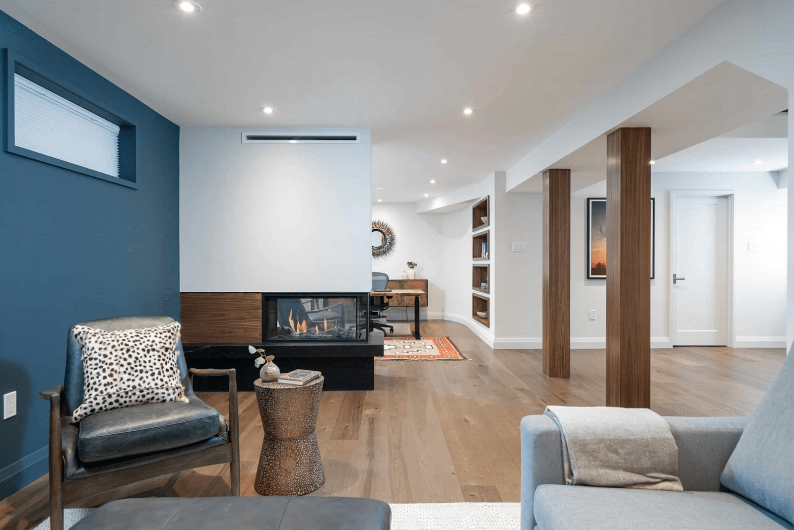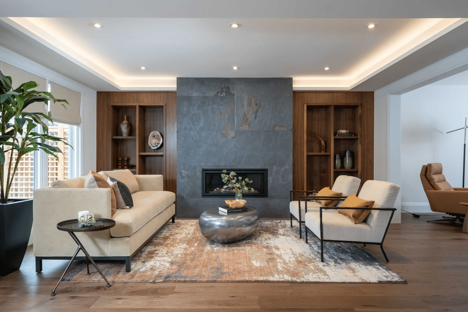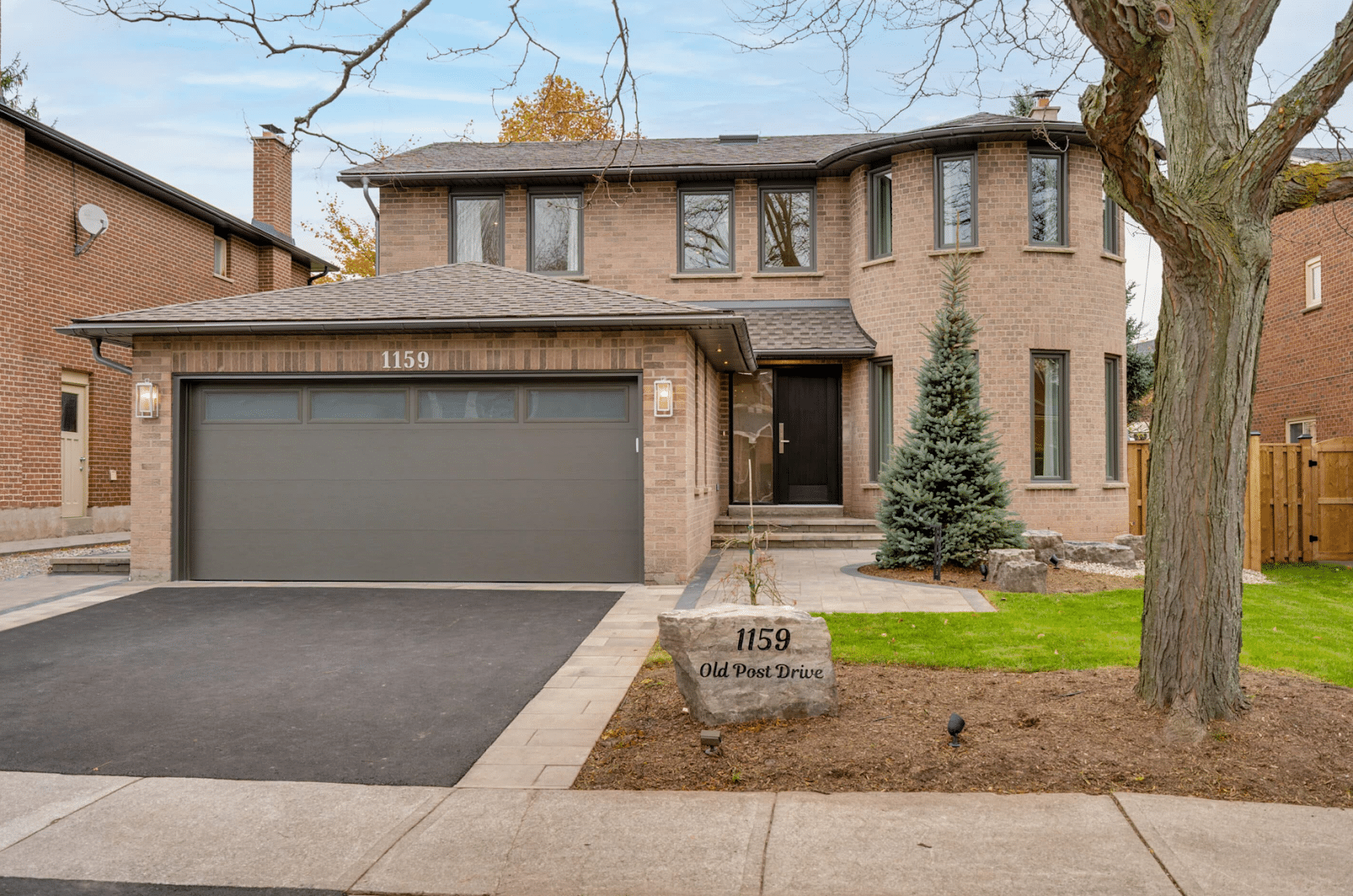 Project Old Post is a full interior gut renovation and exterior transformation, designed in collaboration with Lisa Frahm. This home blends luxurious modern design with warm, tailored details and a meticulous attention to craftsmanship. The reimagined layout is anchored by a dramatic dual-height foyer featuring a sculptural glass staircase that sets the tone for the rest of the home. At its heart is a contemporary custom kitchen, paired with a striking slate fireplace framed by custom walnut built-ins. Rich materials and layered textures—including wallpaper accents and walnut millwork—bring depth and warmth to each space. Upstairs, all bathrooms showcase high-end finishes and custom walnut vanities. Within the primary suite, a bespoke headboard wall integrates bedside tables, lighting, and even custom walnut power outlets, merging form and function with elegance. The transformation continues outdoors with comprehensive hardscaping and softscaping, including an elevated new driveway that enhances the home’s curb appeal and completes this thoughtfully executed renovation.