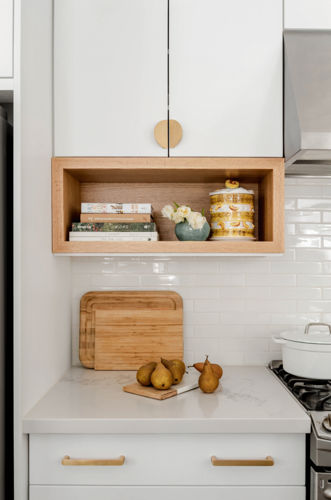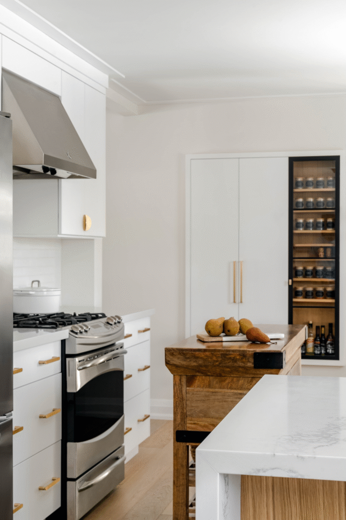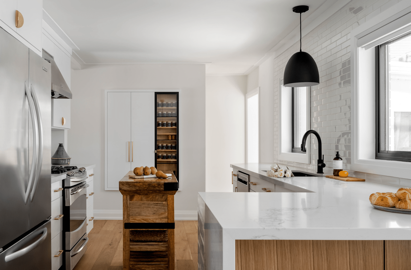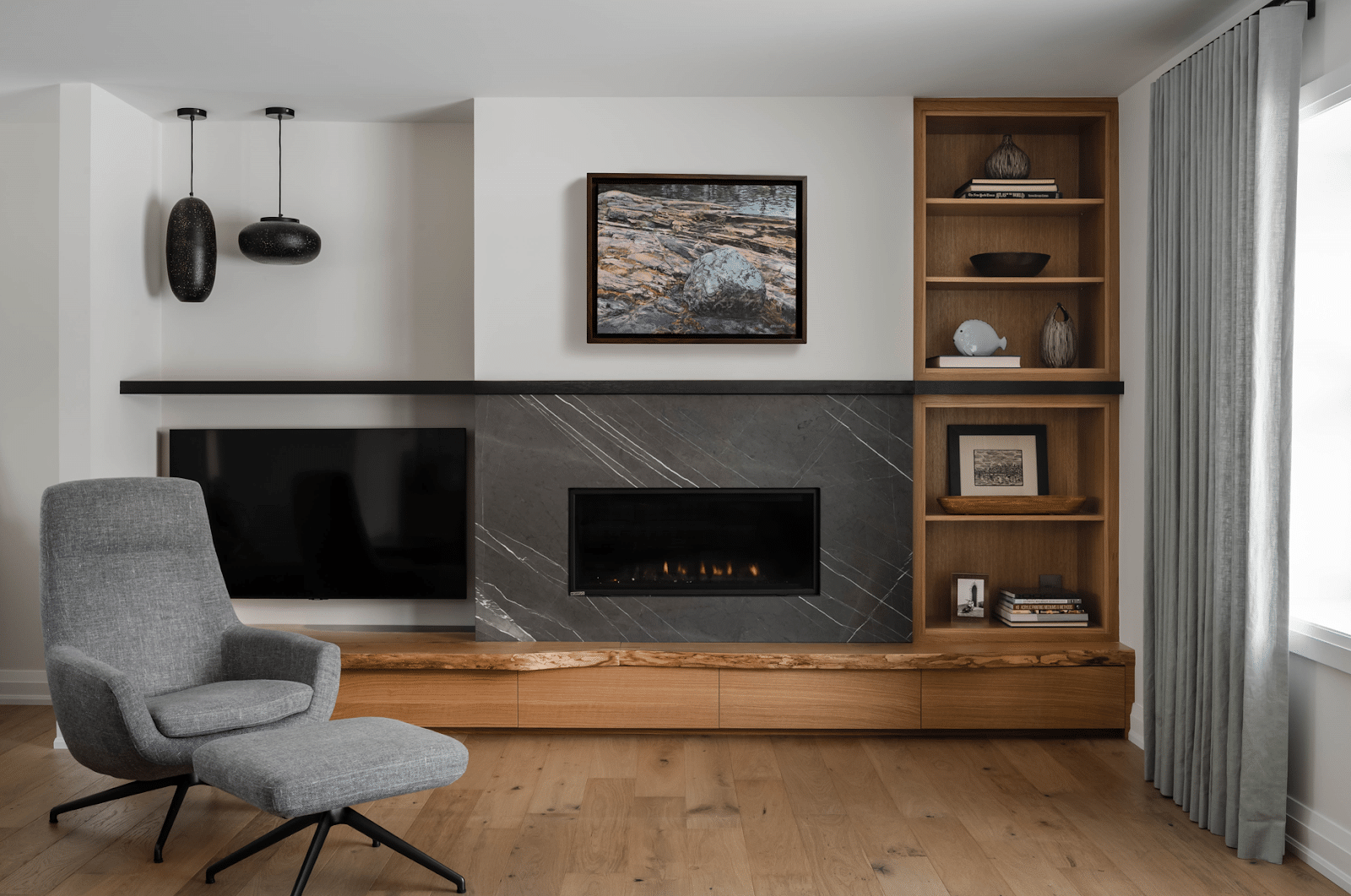 Project Gary is a thoughtful interior renovation and exterior refresh that worked within the home’s original footprint to deliver an elevated new look and feel. Outside, a soft white brick stain gives the façade a clean, refreshed character—subtle but transformative. Inside, the living room now features custom millwork anchored by a marble-clad fireplace and flanked with white oak storage, detailed with a striking live edge feature. The kitchen layout remains familiar, but the finishes have been completely reimagined—outdated granite and traditional cabinetry replaced with sleek profiles and timeless materials, creating a space that feels both modern and made for gathering.