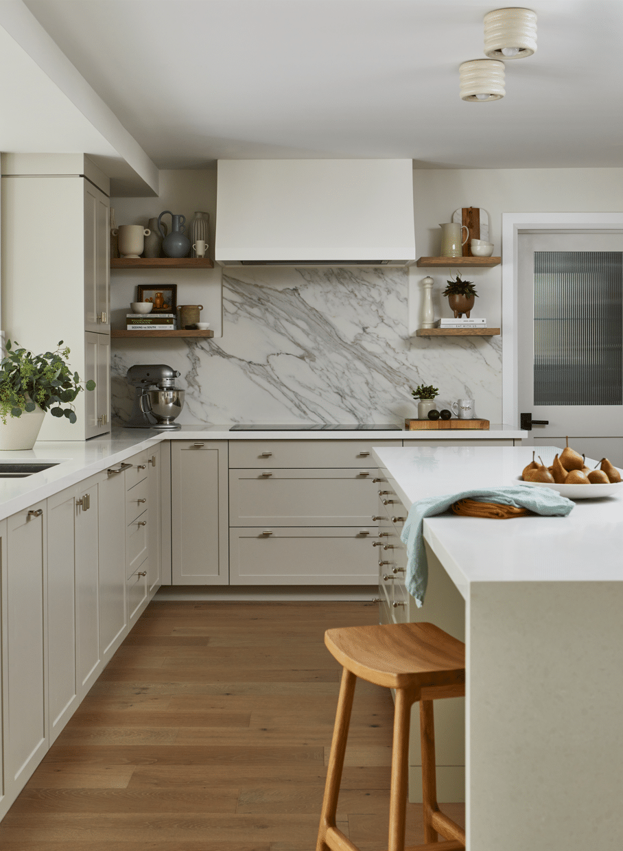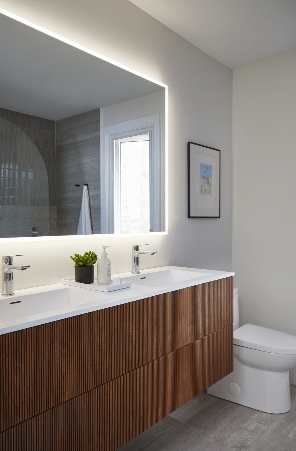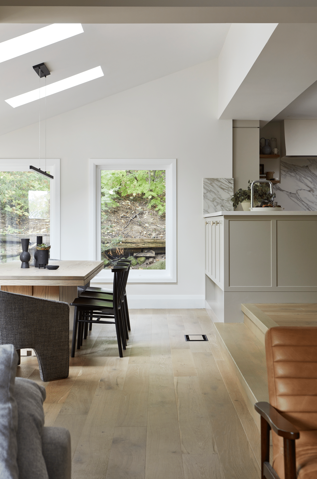 This interior renovation thoughtfully preserves the home’s original layout while incorporating essential structural enhancements, inculding steel beams that allow for a more open and connected main floor. Custom kitchen millwork brings both functionality and visual harmony, grounding the space with timeless craftsmanship. The previously unfinished basement was transformed into a lively and versatile lower level, complete with a recreation room, guest bedroom, home gym and a full bathroom featuring a luxurious steam shower.
